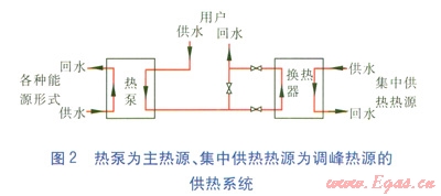 當(dāng)今,多熱源熱泵技術(shù)日臻成熟,太陽(yáng)能、風(fēng)能、污水、土壤等眾多熱源均可作為低品質(zhì)熱源,通過(guò)熱泵轉(zhuǎn)換為高品質(zhì)熱源供熱。因此,在天津市能源集團(tuán)“全市一網(wǎng)”戰(zhàn)略部署中,設(shè)置大型熱泵能源站,以熱泵為主熱源承擔(dān)廣大熱用戶的基本負(fù)荷,以集中供熱的熱水為調(diào)峰熱源,在尖峰時(shí)段加熱熱泵低溫?zé)崴浞掷脽岜媚茉吹耐瑫r(shí),也大大減小了集中供熱的一級(jí)管網(wǎng)流量,為實(shí)現(xiàn)集中供熱大規(guī)?;?、更多地?fù)屨脊崾袌?chǎng)份額起到了至關(guān)重要的作用。熱泵為主熱源、集中供熱熱源為調(diào)峰熱源的供熱系統(tǒng)見(jiàn)圖2。