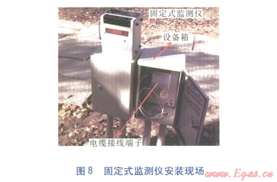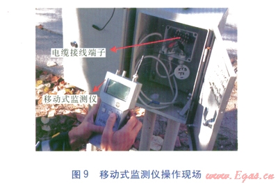 固定式監(jiān)測(cè)儀由220V電源供電,最大監(jiān)測(cè)管段長度為5km,對(duì)于長距離熱網(wǎng),應(yīng)根據(jù)監(jiān)測(cè)儀的最大監(jiān)測(cè)管段長度,將熱網(wǎng)分為若干獨(dú)立的監(jiān)測(cè)回路。固定式監(jiān)測(cè)儀置于專門設(shè)備箱內(nèi),故障信號(hào)可上傳至監(jiān)測(cè)中心,實(shí)施遠(yuǎn)距離監(jiān)測(cè)系統(tǒng)集中管理。移動(dòng)式監(jiān)測(cè)儀能夠?qū)?span lang="EN-US">2~5km長度范圍內(nèi)的管段進(jìn)行監(jiān)測(cè),可實(shí)現(xiàn)對(duì)附近沒有電源無法設(shè)置固定式監(jiān)測(cè)儀及某些分支管段的監(jiān)測(cè)。固定式監(jiān)測(cè)儀安裝現(xiàn)場(chǎng)、移動(dòng)式監(jiān)測(cè)儀操作現(xiàn)場(chǎng)分別見圖8、9。