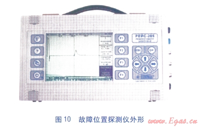 故障位置探測(cè)儀主要用于確定故障位置,一旦監(jiān)測(cè)中心接到報(bào)警信息,并確定報(bào)警固定式監(jiān)測(cè)儀具體位置,或由移動(dòng)式監(jiān)測(cè)儀監(jiān)測(cè)出故障管段。操作人員攜帶故障位置探測(cè)儀,對(duì)故障管段進(jìn)行故障點(diǎn)定位。故障位置探測(cè)儀的監(jiān)測(cè)管段長度為2~10km,與電纜接線端子的接入方法與移動(dòng)式監(jiān)測(cè)儀相同,設(shè)備外形見圖10。