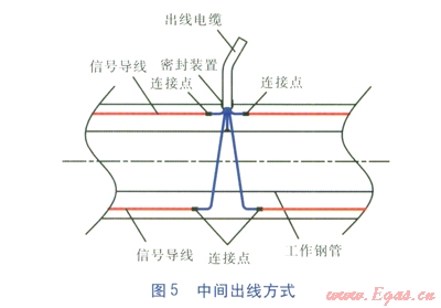 中間出線用于將整個(gè)管網(wǎng)分成若干一定長度的管段,以滿足監(jiān)測(cè)儀最大監(jiān)測(cè)管段長度的需要。出線電纜采用五芯導(dǎo)線,其中四根導(dǎo)線分別連接4根信號(hào)導(dǎo)線,第五根導(dǎo)線連接工作鋼管,出線電纜通過密封裝置引出,見圖5。