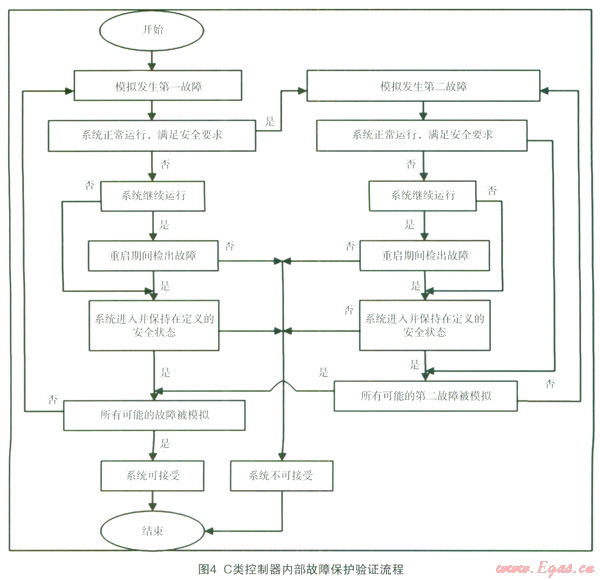 實(shí)際上,C類控制器的電路要求是基于電子器件的失效模式及影響提出的,具有C類安全的控制器設(shè)計(jì)應(yīng)保證在第1和第2個(gè)獨(dú)立內(nèi)部故障情況下,控制器應(yīng)保持在規(guī)定的安全狀態(tài)或進(jìn)行處理到規(guī)定的安全狀態(tài),第3個(gè)獨(dú)立故障不予考慮。這是評(píng)估或驗(yàn)證設(shè)計(jì)是否符合C類安全要求的要點(diǎn)。故障導(dǎo)入的驗(yàn)證流程如圖4所示。