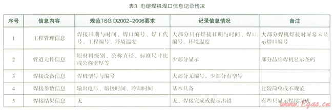 在焊口信息記錄方面,各品牌電熔焊機都具有數(shù)據(jù)檢索存儲功能,配置相應的輸出接口(數(shù)據(jù)下載或打印接口),存儲容量高于標準和規(guī)范要求(不少于250個)。但是,與全自動熱熔焊機一樣存在信息不規(guī)范或不全的問題。對于具有可追溯性的焊口信息來說,應至少包括工程管理、管道元件信息、焊接設備信息、焊接參數(shù)信息和焊接結(jié)果信息等5個方面。如表3所示,不少焊機記錄的焊口信息過于簡單和不規(guī)范。這既與目前相關標準和規(guī)范對此要求不夠具體有關,又與對焊口信息對焊接工程管理重要性認識不足有關。
