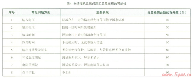 表4匯總了檢測過程中發(fā)現(xiàn)的常見問題以及占總檢測臺數(shù)的百分數(shù)。其中常見的直接影響焊接質(zhì)量的問題主要是輸出電壓和環(huán)境溫度測量,而電阻值測量與焊口信息兩方面是電熔焊機普遍存在的問題。這應引起焊機廠家與焊接質(zhì)量管理部門的重視。