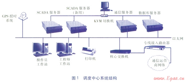調(diào)度中心是整個(gè)SCADA系統(tǒng)的調(diào)度指揮中心,操作人員在調(diào)度指揮中心通過計(jì)算機(jī)系統(tǒng)即可完成對整個(gè)城市燃?xì)廨斉涔芫W(wǎng)的監(jiān)控和運(yùn)行管理等任務(wù)。調(diào)度指揮中心配置SCADA服務(wù)器、通信服務(wù)器、數(shù)據(jù)庫服務(wù)器、專線接入路由器、核心交換機(jī)、操作員工作站、工程師工作站等設(shè)備,并通過局域網(wǎng)相連,系統(tǒng)結(jié)構(gòu)見圖1。