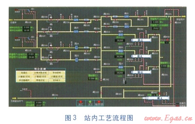 圖3和圖4分別為各站工藝流程動(dòng)態(tài)顯示功能中的站內(nèi)工藝流程圖和歷史曲線圖,可分別實(shí)現(xiàn)重要站點(diǎn)工藝流程圖動(dòng)態(tài)實(shí)時(shí)顯示和歷史趨勢圖的顯示。