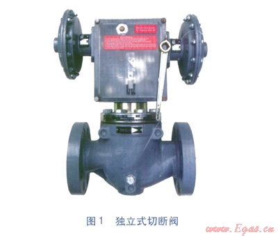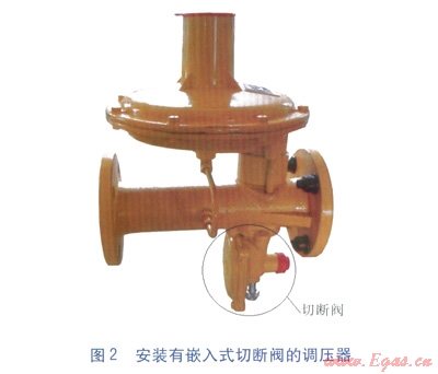 城鎮(zhèn)燃?xì)庾粤κ角袛嚅y根據(jù)組裝方式不同,主要分為兩大類(lèi):一種是作為獨(dú)立的切斷裝置,安裝于調(diào)壓器之前,稱(chēng)為獨(dú)立式切斷閥,見(jiàn)圖1;另外一種是集成于調(diào)壓器上,作為調(diào)壓器的輔助構(gòu)件之一,稱(chēng)為嵌入式切斷閥,見(jiàn)圖2。