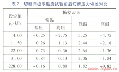 ④極限溫度條件會(huì)導(dǎo)致切斷閥的實(shí)際切斷壓力值與切斷壓力設(shè)定值之間產(chǎn)生一定的偏差,且比常溫條件下的偏差更大。因此廠(chǎng)家在進(jìn)行產(chǎn)品研發(fā)時(shí),要充分考慮極限溫度條件對(duì)切斷閥切斷性能的影響。