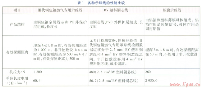 ①摒棄壓膜示蹤線之后,目前較多選用BV塑料銅芯線作為示蹤線代用產(chǎn)品,但因其是非專(zhuān)業(yè)產(chǎn)品,存在成本高、抗腐蝕和抗老化性能差、抗拉力有局限性、長(zhǎng)度短致使接頭增多等缺陷。筆者建議可改用Ⅲ代銅包鋼燃?xì)鈱?zhuān)用示蹤線,兇其具有電阻小、抗拉強(qiáng)度高、抗腐蝕和抗老化性能好、長(zhǎng)度長(zhǎng)可減少接頭、連接處有專(zhuān)用連接防護(hù)接頭等優(yōu)勢(shì),可滿(mǎn)足水平定向鉆敷設(shè)PE燃?xì)夤艿缹?duì)示蹤線的要求。根據(jù)中山順康塑料制品公司提供的數(shù)據(jù),對(duì)幾種示 蹤線進(jìn)行性能比較,見(jiàn)表1。