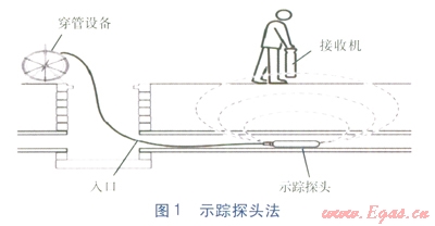 從以上論述可知,雖然對(duì)常規(guī)示蹤線探測(cè)技術(shù)采取了相應(yīng)改進(jìn)措施,但是由于常規(guī)示蹤線探測(cè)技術(shù)存在易受干擾等諸多瓶頸問(wèn)題,因此筆者認(rèn)為僅靠該方法對(duì)水平定向鉆進(jìn)敷設(shè)PE管道進(jìn)行定位存在不足及風(fēng)險(xiǎn),致使出現(xiàn)竣工后實(shí)際管道無(wú)法探測(cè)的失敗案例也很正常。因此,尋求一種更為穩(wěn)妥的適合于水平定向鉆進(jìn)敷設(shè)的PE管道(以下簡(jiǎn)稱(chēng)拉管管道)定位方法是本文致力探索的方向。筆者就數(shù)年實(shí)踐經(jīng)驗(yàn)及查閱文獻(xiàn),推薦由鉆頭軌跡法、示蹤探頭法、常規(guī)示蹤線法三管齊下的準(zhǔn)確定位方法,可較好地解決水平定向鉆敷設(shè)PE管道的定位問(wèn)題。