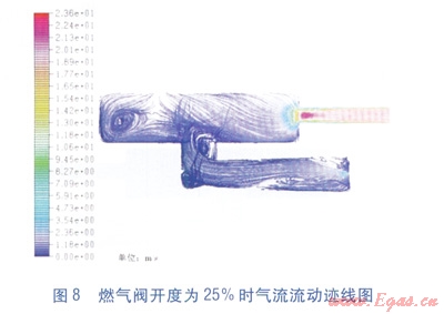 利用FLUENT軟件對(duì)比模擬了燃?xì)忾y開度為25%和75%兩種條件下爐腔內(nèi)的氣體流動(dòng)狀態(tài)。計(jì)算得出兩種狀態(tài)下整個(gè)爐腔內(nèi)氣流的最高流速分別為24.61m/s和46.86m/s。高速流主要出現(xiàn)在爐腔排氣導(dǎo)管。