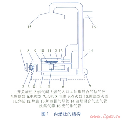 內(nèi)燃灶的結(jié)構(gòu)見圖l。工作時(shí),空氣連同炊事產(chǎn)生的油煙、水蒸氣通過風(fēng)機(jī)壓送到封閉的爐腔內(nèi),燃?xì)庠谧陨韷毫ψ饔孟逻M(jìn)入燃燒器,并在高于大氣壓的條件下燃燒,加熱爐板,爐板可直接加熱食物或其他烹飪炊具;高溫廢氣在排出的過程中加熱油煙混合氣進(jìn)氣管內(nèi)的氣體,減少廢氣余熱的浪費(fèi),提高系統(tǒng)熱效率[5]。