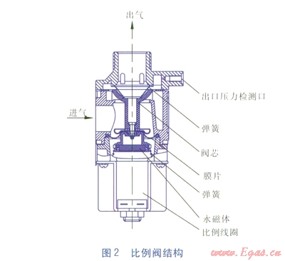 比例閥還具有穩(wěn)定燃?xì)鈮毫ψ饔茫?dāng)作用在壓力調(diào)節(jié)器膜片上的燃?xì)鈮毫υ龃髸r(shí),膜片帶動(dòng)閥芯向下運(yùn)動(dòng)減小相對(duì)開度,保證出口壓力的穩(wěn)定;反之,當(dāng)作用在壓力調(diào)節(jié)器膜片上的燃?xì)鈮毫p小時(shí),膜片帶動(dòng)閥芯向上運(yùn)動(dòng)增大相對(duì)開度,保證出口壓力的穩(wěn)定。