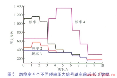 燃燒室4個不同頻率壓力信號跳車前后10s數(shù)據(jù)如圖5所示,這4個壓力信號表征燃燒室火焰振蕩特征頻段的強度。頻率l、頻率2、頻率3、頻率4代表頻率依次降低。從圖5可以看出,在2s左右,高頻段頻率1、頻率2的值突降,圖3和圖4中7號燃燒室的溫度也突然降低;3s左右,高頻段強度進(jìn)一步降低,低頻段信號頻率4突然增強,7號燃燒室的溫度也再次下降;4s左右,這一趨勢進(jìn)一步加強,7號燃燒室溫度也進(jìn)一步降低;6s以后,所有頻段的信號強度都減弱,這是因為主、輔燃料閥都已經(jīng)關(guān)小,燃燒室功率下降。從以上變化趨勢可以看出,火焰高頻振動減弱、低頻振動加強代表燃燒不穩(wěn)定的增強,最后導(dǎo)致火焰被吹滅,燃燒室溫度下降。該廠現(xiàn)場操作人員也反映,燃?xì)廨啓C運行過程中除了正常的運行噪聲外,還有周期性的轟隆聲,這些外部表現(xiàn)與燃?xì)廨啓C熱聲振蕩燃燒現(xiàn)象非常相似。周期性的燃燒不穩(wěn)定,并且出現(xiàn)較大振幅的壓力波動,這種現(xiàn)象通常稱為熱聲振蕩燃燒。