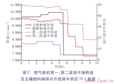 SGT200-2S燃?xì)廨啓C為雙軸燃?xì)廨啓C,燃?xì)廨啓C第一、第二段透平軸轉(zhuǎn)速及主輔燃料閥相對開度跳車前后l0s數(shù)據(jù)如圖2所示,左側(cè)縱坐標(biāo)表示燃?xì)廨啓C透平轉(zhuǎn)速,右側(cè)縱坐標(biāo)表示主輔燃料閥相對開度。
