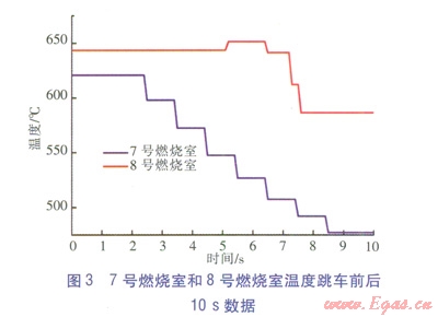 SGT-200-2S燃?xì)廨啓C有8個燃燒室,每個燃燒室都設(shè)置了測溫?zé)犭娕迹?span lang="EN-US">7號燃燒室和8號燃燒室跳車前后10s數(shù)據(jù)如圖3所示,其他燃燒室溫度變化情況與8號燃燒室情況類似。