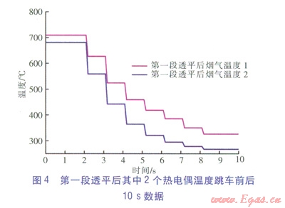 燃?xì)廨啓C第一段透平后設(shè)置了16個測溫?zé)犭娕?,其?span lang="EN-US">2個熱電偶跳車前后l0s數(shù)據(jù)如圖4所示,根據(jù)熱電偶測點位置可以確定這兩個熱電偶測得的是7號燃燒室后的煙氣溫度。圖4中的數(shù)據(jù)顯示第一級透平后的溫度甚至高于圖3中燃燒室的溫度,這是因為圖3中顯示的燃燒室溫度并不是透平進(jìn)口初溫(該溫度通常為ll00℃以上),而是實際燃燒室內(nèi)熱電偶布點處的溫度,由于燃燒室溫度并不是均勻的,該熱電偶所處位置溫度較低。