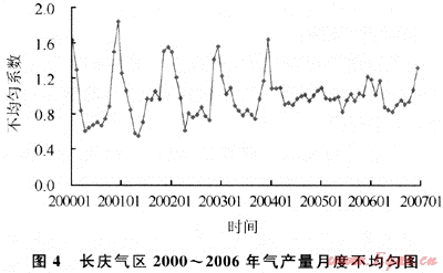 近幾年由于受國家經濟宏觀調控政策和城市環(huán)保要求提高等因素的影響,民用、發(fā)電等用氣增長較快,但民用和采暖用氣的季節(jié)性不均勻問題突出,冬季高月和夏季低月值相差很大。中國石油每年的1、2、3、10、11、12等6個月的不均勻系數(shù)偏大(不均勻系數(shù)為月產量與年均月產量的比值),最高為12月份,連續(xù)6a的12月不均勻系數(shù)都在1.2以上,2005年不均勻系數(shù)達到了1.54的高峰,峰谷差為1.3~1.5倍(圖3)[4~5]。