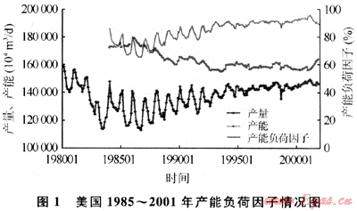 美國的產能負荷因子直接受氣價的影響,高氣價直接刺激新鉆井和完井工藝的增加,產能也隨之增加,產能負荷因子降低。而產能負荷因子反過來又影響價格和鉆井,如果產能負荷因子超過90%,就會引起儲氣量減少、價格上漲等。當天然氣產能負荷因子低于90%時,天然氣井口平均價格都在0.1美元/m3以下。天然氣價格的低迷導致鉆井和完井數(shù)量的減少,產能隨之降低,產能負荷因子上升。如1998~1999年低油氣價格導致天然氣產能負荷因子增加到90%~92%。