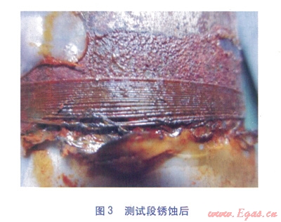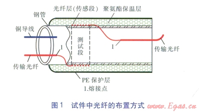 試件為一段長(zhǎng)度為200mm的鋼管(材質(zhì)為Q235),對(duì)銹蝕測(cè)試段外壁進(jìn)行拋光處理,拋光后測(cè)試段外直徑為73.8mm,壁厚為3.5m。試件中光纖的布置方式見(jiàn)圖l。在距鋼管端面50mm處纏繞光纖層(傳感段),纏繞時(shí)使光纖帶有一定的預(yù)應(yīng)力,保證光纖與鋼管表面緊密接觸,纏繞的光纖總長(zhǎng)度在4m左右。將光纖用環(huán)氧樹(shù)脂膠固定在鋼管上,傳感段的引出端與帶保護(hù)套的傳輸光纜熔接,將熔接處進(jìn)行保護(hù)處理,并在鋼管兩端的引出位置用環(huán)氧樹(shù)脂膠進(jìn)行固定。光纖設(shè)置完畢后,在鋼管與PE保護(hù)管間進(jìn)行發(fā)泡處理。