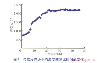 將5個(gè)連續(xù)有效測(cè)點(diǎn)的光纖平均應(yīng)變作為傳感段光纖平均應(yīng)變,傳感段光纖平均應(yīng)變隨測(cè)試時(shí)間的變化見(jiàn)圖4。