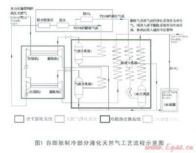 (2)自膨脹制冷部分液化天然氣工藝流程主要包括:原料天然氣的過濾、計量及加壓,原料天然氣的凈化,30%凈化天然氣的液化,70%膨脹氣流的制冷;主要設(shè)備系統(tǒng)則包括:天然氣凈化系統(tǒng),透平膨脹系統(tǒng),冷箱熱交換系統(tǒng),以及LNG儲罐系統(tǒng)。