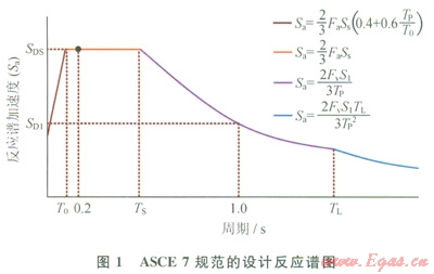 頻譜分析法中頻譜的設(shè)計(jì)與取值通常參照美國土木工程師學(xué)會(huì)ASCE 7—05《建筑物和其他結(jié)構(gòu)的最低設(shè)計(jì)載荷規(guī)范》(Minimum Design Loads for Buildings and Other Structures)[14],相對(duì)我國的GB 50011《建筑抗震設(shè)計(jì)規(guī)范》其取值較為保守[]15]。圖1為ASCE 7規(guī)范的設(shè)計(jì)反應(yīng)譜示意圖,它的周期區(qū)間分為4個(gè),不同的區(qū)間所對(duì)應(yīng)的反應(yīng)譜加速度計(jì)算公式不同(圖1中列出),其中,SDS和SD1用于選擇抗震設(shè)計(jì)類別和分析方法。