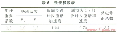 根據(jù)XX管道給出的地震資料,可根據(jù)GB 5001l《建筑抗震設(shè)計(jì)規(guī)范》查得土地的特征周期、水平地震影響系數(shù)最大值等參數(shù),根據(jù)SS(4%阻尼系數(shù))和S1(4%阻尼系數(shù))的值,分別在ASCE 7-05規(guī)范中表11.4.1和11.4.2查得場地系數(shù)Fa和Fv。在CAESARⅡ軟件的頻譜分析模塊輸入相關(guān)的地震頻譜參數(shù),軟件計(jì)算后會(huì)生成頻譜分析結(jié)果圖。XX管道所在的地震區(qū)域頻譜參數(shù)如表5所示,頻譜分析結(jié)果如圖3所示,工況組合情況如表6所示[18-22]。