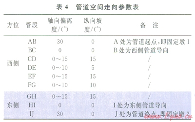 管道總長度約為780m,起點(diǎn)和終點(diǎn)分別設(shè)置固定墩l、2,用以截?cái)嘌芯繉?duì)象外管道對(duì)模型的影響。西側(cè)進(jìn)土導(dǎo)向B前有30m長的管段,與入土處有30°的偏離;西側(cè)水平管段長約為110m,斜管總長約為215m;東側(cè)出土導(dǎo)向工后有30m長的管段,與出土處有30°的偏離;東側(cè)水平管段長為105m,斜管長約為290m。管道均采用大開挖的敷設(shè)方式,彎管的曲率半徑(R)為6D(D為管道外徑),地區(qū)等級(jí)為l級(jí),設(shè)計(jì)系數(shù)為0.72。管道為空間結(jié)構(gòu),在X、Y、Z方向上均有長度分量,其在XOY平面上的走向如圖2所示,具體空間參數(shù)如表4所示。