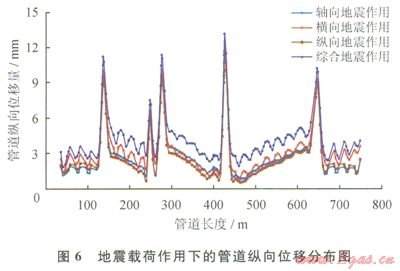1)軸向、橫向、縱向及綜合地震作用對(duì)管道的橫向位移影響最大,且最大橫向位移明顯高于最大軸向及縱向位移,說明輸氣管道在穿越地震帶時(shí),應(yīng)重點(diǎn)對(duì)管道的橫向位移量進(jìn)行監(jiān)測(cè)。