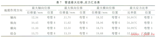 5)綜合地震作用所產(chǎn)生的管道位移、應(yīng)力較任一單方向地震作用高,說明綜合地震載荷對(duì)管道的破壞最大。