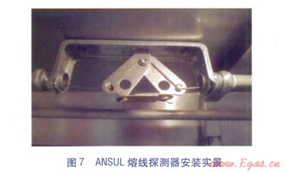 ④熔線(xiàn)探測(cè)器(見(jiàn)圖6)。熔線(xiàn)探測(cè)器布置在保護(hù)區(qū)的上方,通過(guò)額定溫度的合金熔線(xiàn)進(jìn)行自動(dòng)探測(cè),當(dāng)溫度超過(guò)額定溫度時(shí),熔線(xiàn)斷開(kāi),鋼絲繩索松開(kāi)。其安裝圖見(jiàn)圖7。