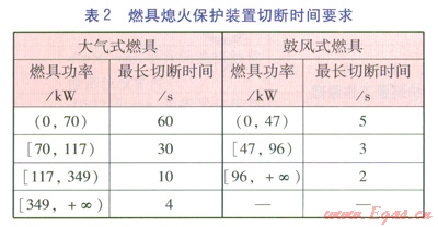 在工程實(shí)踐中,要求在燃具的每個(gè)燃燒器上都設(shè)置獨(dú)立的熄火保護(hù)裝置。另外,熄火保護(hù)裝置從檢測(cè)到?jīng)]有火焰到給出有效信號(hào)切斷燃?xì)夤?yīng)的整個(gè)操作過(guò)程必須是在安全合理的時(shí)間內(nèi),因?yàn)榇瞬僮鬟^(guò)程時(shí)間過(guò)長(zhǎng),燃具泄漏的燃?xì)膺^(guò)多,危險(xiǎn)性過(guò)高,保護(hù)裝置就失去了意義。對(duì)于不同類(lèi)型及功率燃具的熄火保護(hù)裝置的最長(zhǎng)切斷時(shí)間,澳門(mén)地區(qū)的相關(guān)燃?xì)夥ㄒ?guī)要求見(jiàn)表2。