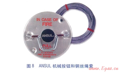 ⑤機(jī)械按鈕(見(jiàn)圖8)。是手動(dòng)啟動(dòng)滅火系統(tǒng)的操作工具,通過(guò)鋼絲繩索管連接到釋放裝置。機(jī)械按鈕拉環(huán)設(shè)計(jì)成允許三個(gè)手指操作,并有紅色字樣標(biāo)志,方便快速辨認(rèn)。