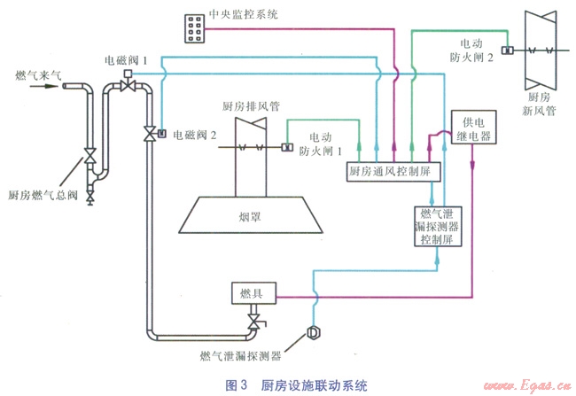 由于在商業(yè)廚房?jī)?nèi)安裝燃?xì)庠O(shè)施種類(lèi)及數(shù)量較多,需要防止燃?xì)庑孤?,同時(shí)在廚房火災(zāi)發(fā)生時(shí),若有燃?xì)庵紕t火災(zāi)更加難以控制,造成的災(zāi)難更大?;诎踩珳?zhǔn)則,工程實(shí)踐中,通常在商業(yè)廚房的燃?xì)饪傞y的下游設(shè)置一組電磁閥,與燃?xì)庑孤┨綔y(cè)器、廚房通風(fēng)管道內(nèi)的電動(dòng)防火閘、供電繼電器聯(lián)動(dòng)。當(dāng)燃?xì)庑孤┨綔y(cè)器偵測(cè)到泄漏發(fā)生時(shí),發(fā)出報(bào)警,電磁閥關(guān)閉、電動(dòng)防火閘關(guān)閉、供電繼電器切斷廚房燃具電源。由上述設(shè)備組成的廚房聯(lián)動(dòng)系統(tǒng)同時(shí)切斷了可燃物燃?xì)?、助燃物空氣的供?yīng)以及消除可能存在的點(diǎn)火源。電動(dòng)防火閘的關(guān)閉則更是可以遏制火災(zāi)經(jīng)通風(fēng)管道向其他地方蔓延。廚房設(shè)施聯(lián)動(dòng)系統(tǒng)見(jiàn)圖3。