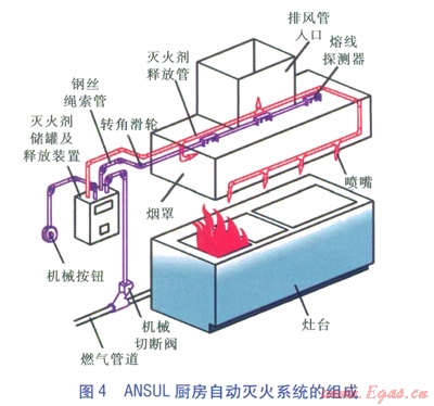 ANSUL廚房自動(dòng)滅火系統(tǒng)的工作原理如下:廚房著火導(dǎo)致布在廚房保護(hù)區(qū)(即灶臺(tái)、煙罩及其排風(fēng)管入口附近等火災(zāi)危險(xiǎn)區(qū))的探測(cè)器熔線(xiàn)斷開(kāi),引發(fā)連接在探測(cè)器上的鋼絲繩索松開(kāi),滅火劑釋放裝置啟動(dòng),打開(kāi)動(dòng)力氣筒,釋放出高壓氣體進(jìn)入滅火劑儲(chǔ)罐,把滅火劑壓出并通過(guò)釋放管道輸送至噴嘴噴向保護(hù)區(qū),同時(shí)釋放裝置控制鋼絲繩索關(guān)閉機(jī)械切斷閥。ANSUL廚房自動(dòng)滅火系統(tǒng)的組成見(jiàn)圖4。