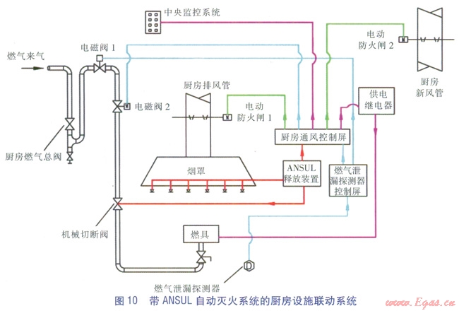 對(duì)于基于燃?xì)庑孤┨綔y(cè)的聯(lián)動(dòng)的缺陷,我們不敢掉以輕心,經(jīng)過(guò)與設(shè)計(jì)團(tuán)隊(duì)中消防工程師進(jìn)行深入的探討,以及咨詢(xún)?nèi)季邚S(chǎng)商的專(zhuān)業(yè)意見(jiàn),針對(duì)商業(yè)廚房的特性,在進(jìn)一步的工程實(shí)踐中,在廚房增設(shè)ANSUL自動(dòng)滅火系統(tǒng),燃?xì)夤?yīng)系統(tǒng)與之聯(lián)動(dòng),而不僅僅是設(shè)置電磁閥與燃?xì)庑孤┨綔y(cè)器。