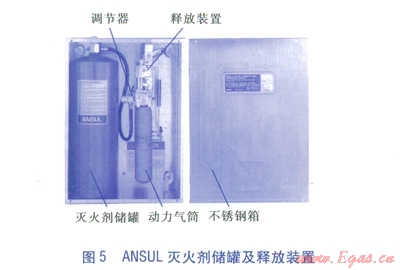 ②調(diào)節(jié)型釋放裝置。屬于一種裝有彈簧的機(jī)械、氣動(dòng)釋放裝置,配置一個(gè)儲(chǔ)存二氧化碳或氮?dú)獾膭?dòng)力氣筒,向滅火劑儲(chǔ)罐提供動(dòng)力氣供應(yīng),氣筒上安裝有調(diào)節(jié)器,氣筒的密封層設(shè)計(jì)成由釋放裝置擊穿。釋放裝置由熔線(xiàn)探測(cè)系統(tǒng)進(jìn)行自動(dòng)啟動(dòng),釋放裝置還可以通過(guò)鋼絲繩索連接設(shè)置在保護(hù)區(qū)以外的機(jī)械按鈕進(jìn)行遙控手動(dòng)開(kāi)啟,另外可與大廈中央監(jiān)控系統(tǒng)的連接線(xiàn)兼容,將有關(guān)信號(hào)自動(dòng)傳輸?shù)酱髲B中央監(jiān)控系統(tǒng)。ANSUL滅火劑儲(chǔ)罐及釋放裝置見(jiàn)圖5。