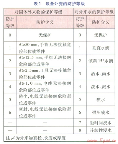 國(guó)際防護(hù)符號(hào)IP,即Ingress Protection Rating(防護(hù)等級(jí)),或International Protection Rating(國(guó)際保護(hù)等級(jí)),表示裝置外殼的防護(hù)等級(jí),由IP和后續(xù)的兩位數(shù)字組成。第一個(gè)數(shù)字為0~6,表示對(duì)固體外來(lái)物的保護(hù)等級(jí),第二個(gè)數(shù)字為0~8,表示對(duì)外來(lái)水的保護(hù)等級(jí),數(shù)字越大表示防護(hù)等級(jí)越高。國(guó)際電工技術(shù)委員會(huì)(International Eleetroteehnical Commission,IEC)標(biāo)準(zhǔn)IEC 529《外殼所提供的保護(hù)等級(jí)》(Degrees of Protection Provided by Enclosure)的相關(guān)規(guī)定見(jiàn)表1。