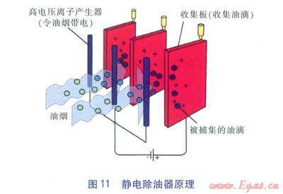 靜電除油器(見(jiàn)圖11),其原理是油煙進(jìn)入高壓電場(chǎng),使油煙粒子帶電,在電場(chǎng)力作用下凝聚成油滴,沉積在收集板上,經(jīng)重力自流從而得到凈化。凈化過(guò)程的分離力直接作用于油煙粒子上,而不是作用于整個(gè)氣流上。因此,靜電除油器具有凈化效率高、壓降小的特點(diǎn)。收集板是其中一個(gè)非常重要的部件,須定期清理以確保靜電除油器的性能。