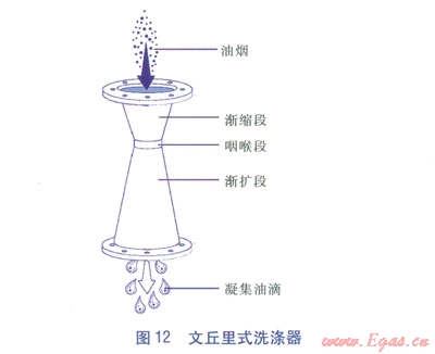 文丘里式洗滌器(見(jiàn)圖l2)由三段組成:漸縮段、咽喉段和漸擴(kuò)段。把油煙氣流壓入文丘里式洗滌器,當(dāng)油煙進(jìn)入漸縮段后,流速增大,進(jìn)入咽喉段時(shí)達(dá)到最大值。洗滌液噴霧則從咽喉段加入,將其清洗。在漸擴(kuò)段,流速減小,壓力回升,油煙粒子凝聚成直徑較大的液滴,進(jìn)而被收集。