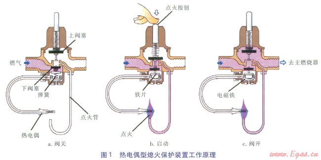 熱電偶熄火保護(hù)裝置的工作過(guò)程如圖l所示。當(dāng)燃具不工作時(shí),下閥塞關(guān)閉主燃?xì)馔?span lang="EN-US">(如圖1a)。當(dāng)按下點(diǎn)火按鈕時(shí),下閥塞打開(kāi),上閥塞關(guān)閉,燃?xì)馔ㄟ^(guò)點(diǎn)火管,燃具點(diǎn)火,同時(shí)鐵片與電磁鐵貼緊,點(diǎn)火火焰將熱電偶加熱,產(chǎn)生電動(dòng)勢(shì),使電磁鐵得磁而吸住鐵片(如圖lb)。此時(shí)放開(kāi)按鈕,上下閥塞均打開(kāi),主燃?xì)馔方油?,燃具正常工?span lang="EN-US">(如圖1c)。當(dāng)火焰意外熄滅時(shí),熱電偶冷卻,電動(dòng)勢(shì)消失,電磁鐵失磁,鐵片脫落,下閥塞在彈簧作用下關(guān)閉氣路(如圖la)。