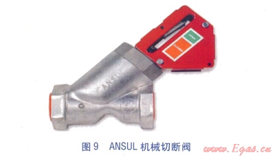 ⑥機(jī)械切斷閥(見(jiàn)圖9)。安裝于廚房燃?xì)饪傞y下游燃?xì)夤艿郎?,?dāng)ANSUL系統(tǒng)啟動(dòng)時(shí),機(jī)械切斷閥由鋼絲繩索控制而關(guān)閉,切斷廚房燃?xì)夤?yīng),經(jīng)手動(dòng)復(fù)位。