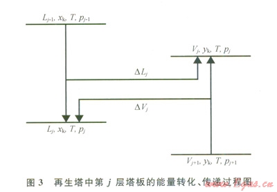 圖3表示再生塔中第j層塔板上能量的傳遞與轉(zhuǎn)換過程。現(xiàn)以其作為研究對象,對該層塔板進(jìn)行分析。
