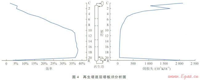 從損失分布圖可以發(fā)現(xiàn),由于雙效精餾過程將再生塔的外部損失合理利用,不僅大大降低了胺液解吸再生過程的熱量消耗,而且也降低了能損失,提高了整個(gè)胺液解吸再生過程的效率。將雙效精餾過程看成一個(gè)整體,其胺液解吸再生過程的效率為12.7%,較之于傳統(tǒng)流程單塔解吸過l2.7%,較之于傳統(tǒng)流程單塔解吸過程,效率提高了約27.0%。