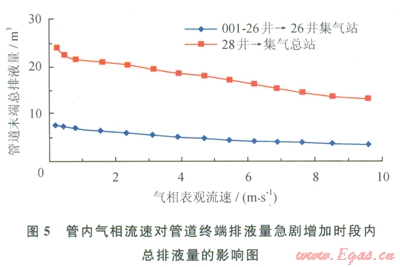 2)對(duì)管道終端總排液量的影響。清管過程中2條管道終端在排液量急劇增加時(shí)段內(nèi)的總排液量如圖5所示。由圖5可知,不同氣相流速對(duì)清管過程中管道終端排液量急劇增加時(shí)段內(nèi)總排液量的變化將產(chǎn)生顯著影響。隨著管內(nèi)氣相流速的增大,管道終端總排液量呈現(xiàn)逐漸遞減的趨勢(shì),這是由于隨著管輸量的增加,管內(nèi)氣流速度增大,氣體的攜液能力增強(qiáng),管內(nèi)總積液量減少,因而清管過程中管道終端總排液量也將減少。