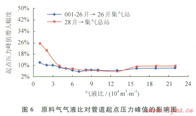 1)對(duì)管道起點(diǎn)壓力的影響。2條管道在不同原料氣氣液比下的管道起點(diǎn)壓力峰值變化情況如圖6所示。由圖6可知,原料氣氣液比也對(duì)清管過程管道起點(diǎn)壓力的變化具有重要影響,即:當(dāng)原料氣氣液比低于4×10m3/m3時(shí),清管過程中管道起點(diǎn)壓力峰值則隨原料氣氣液比的減小而快速增大,尤其當(dāng)原料氣氣液比小于1×104m3/m3后,清管過程中的管道起點(diǎn)壓力峰值將增大到正常生產(chǎn)工況下管道起點(diǎn)壓力的l.1~1.3倍。