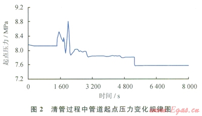 為簡(jiǎn)化起見,僅以001-26井®26井集氣站氣液混輸管道實(shí)際清管作業(yè)為例,分析清管過程中管道起點(diǎn)壓力、管道終端液體流量等工況參數(shù)的變化規(guī)律。