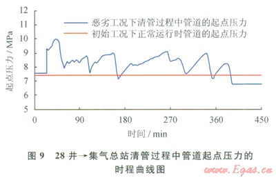 由表4與圖8、9可知,當(dāng)管內(nèi)氣相流速與氣液比均減小時(shí),清管過程中管道的起點(diǎn)壓力峰值和終端排液量均將增大,但不同管道的增大幅度并不一致,體現(xiàn)出的基本規(guī)律為:管道越長(zhǎng)或高程差越大,清管中管道的起點(diǎn)壓力峰值和終端排液量增大幅度越大。其中,對(duì)管道較長(zhǎng)高程差較大的28井®集氣總站管道而言,在管道運(yùn)行到后期可能遇到的惡劣工況下清管過程中管道起點(diǎn)壓力將比管道運(yùn)行初期正常運(yùn)行工況下的起點(diǎn)壓力增大1.35倍,而終端排液量則比管道運(yùn)行初期清管過程中的排液量增大1.41倍。