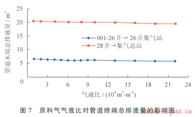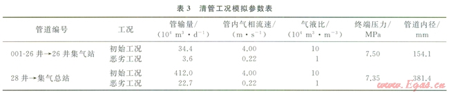 管內(nèi)氣相流速、原料氣氣液比等參數(shù)對(duì)清管過程中的管內(nèi)流體瞬態(tài)流動(dòng)狀況具有重要影響。為此,以001-26井®26井集氣站和28井®集氣總站2條氣液混輸管道為例,分別對(duì)這2條管道開展管內(nèi)氣相流速和原料氣氣液比等參數(shù)的敏感性分析,以考察其對(duì)清管過程的影響。