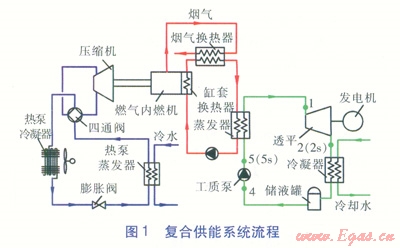 復(fù)合供能系統(tǒng)流程見(jiàn)圖1。復(fù)合供能系統(tǒng)由燃?xì)鈾C(jī)熱泵與有機(jī)朗肯循環(huán)發(fā)電系統(tǒng)組成。燃?xì)鈨?nèi)燃機(jī)驅(qū)動(dòng)壓縮式熱泵機(jī)組向用戶供冷、供熱,燃?xì)鈨?nèi)燃機(jī)產(chǎn)生的缸套冷卻水及煙氣余熱,作為有機(jī)朗肯循環(huán)發(fā)電系統(tǒng)的熱源。有機(jī)朗肯循環(huán)發(fā)電系統(tǒng)包括工質(zhì)泵、蒸發(fā)器、儲(chǔ)液罐、透平膨脹機(jī)(以下簡(jiǎn)稱透平)、發(fā)電機(jī)、冷凝器等。有機(jī)工質(zhì)在蒸發(fā)器內(nèi)與經(jīng)煙氣換熱器升溫的缸套冷卻水進(jìn)行換熱后,高溫高壓的氣態(tài)有機(jī)工質(zhì)進(jìn)入透平膨脹做功,帶動(dòng)發(fā)電機(jī)發(fā)電。透平尾部排出的有機(jī)工質(zhì)進(jìn)入冷凝器定壓(也定溫)冷凝,冷凝器出口的有機(jī)工質(zhì)冷凝為液態(tài),進(jìn)入儲(chǔ)液罐,再由工質(zhì)泵送入蒸發(fā)器完成一次發(fā)電循環(huán)。